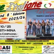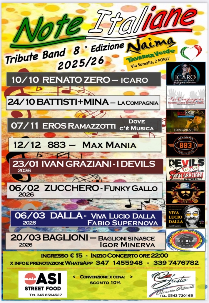 Venerdì 24 Ottobre ULTIMA OCCASIONE PER ASCOLTARE ♥”LA COMPAGNIA”♥ FANTASTICO TRIBUTO A MINA/BATTISTI Apertura sala ore 21 inizio concerto ore 22 circa INGRESSO € 15 POSTO UNICO, X INFO E PRENOTAZIONI: WhatsApp 347 145 5948 – 339 747 6782 Convenzione cena:sconto 10% sul conto totale, Presso il ristorante/Pizzeria: DA GUSTO (50 mt. dal locale) Tel:0543/720165. OASI STREET […]